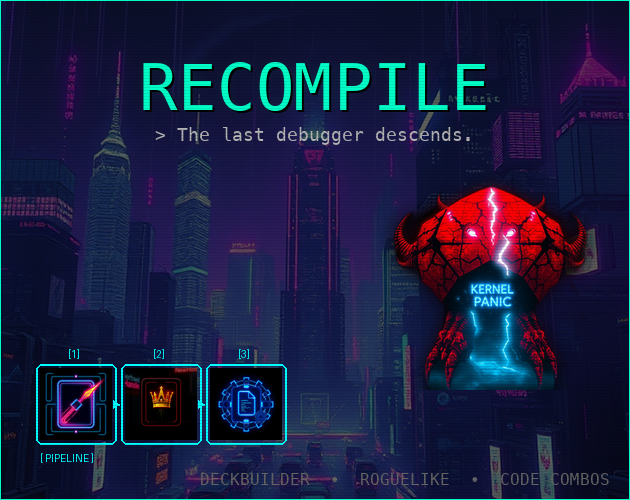 Recompile is a code-combo deckbuilder roguelike. As the last debugger deployed before total system collapse, descend through Application Layer → OS Layer → Kernel, eliminating bugs and completing the recompile.
